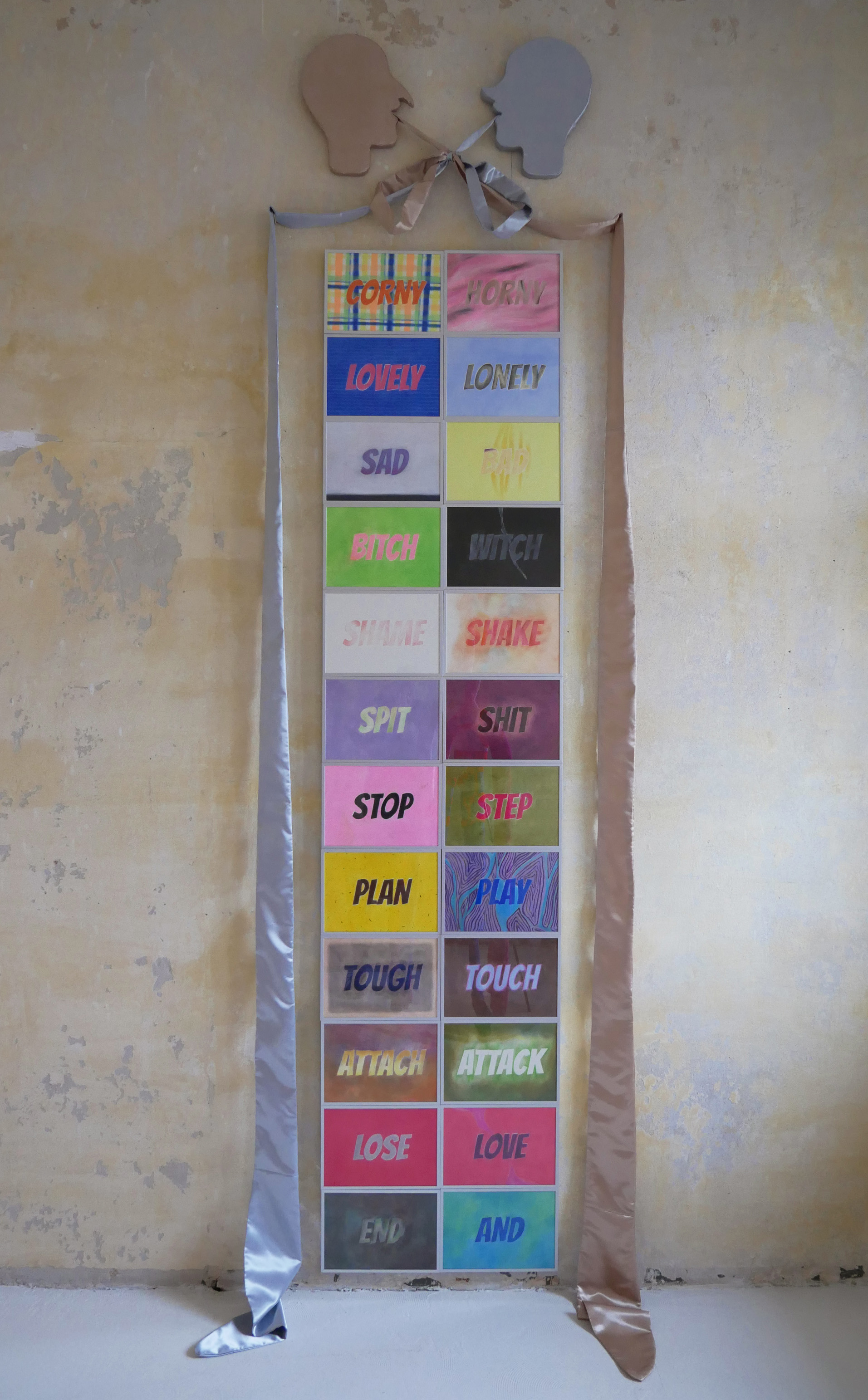 2023 / Installation Maße ca. 350x100cm / Stoffobjekt und 24 Zeichnungen A4 / Pastellkreide, Alurahmen, Satinstoff, Schaumstoff / zum 8.3.2023 / vulva_me Kollektiv / Weltecho, Chemnitz